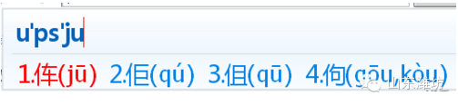3、例如:我们要输入:佢 ,拆成:撇竖巨“upsju”。有很多种方法拆分的,只要你自己想得到,就去尝试,就可以把它打出来。