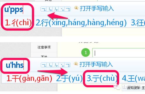 就是首选输入字母“u”,然后把你不认识的字进行拆分输入,按笔画拆分,按字拆分的方式。后面我举几个例子大家就知道了。 1、例如,我们要输入:彳亍 chìchù。这两个字,估计很多人不认识吧。我把它拆成:撇撇竖“upps”和横横竖“uhhs”。明白了吗。