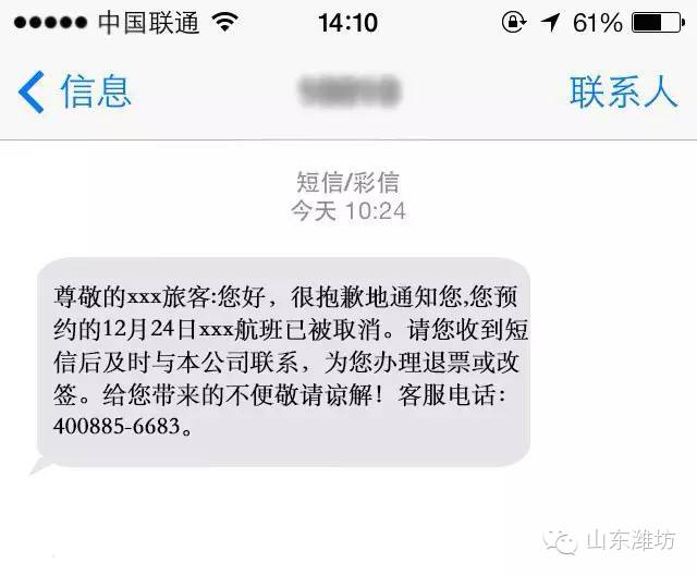 遇到此类短信一定要与订票网站的客服联系,或者直接拨打机场、航空公司的官方电话进行确认。