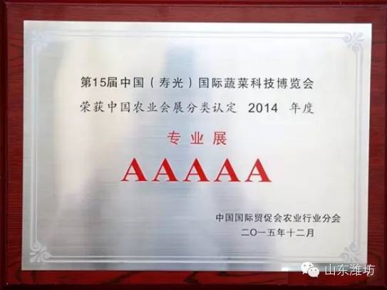 从菜博会组委会办公室获悉,由农业部组织开展的2014年度全国农业展会分类认定结果出炉,第15届中国(寿光)国际蔬菜科技博览会在参与评选的71个农业展会中脱颖而出,被认定为5A级展会,这是展会中最高的一级。据悉,全国农业类展会共有8个展会被认定5A级。