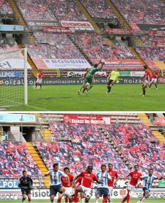 意大利球队特里埃斯蒂纳由于战绩不佳而导致现场球迷人数寥寥无几,引起了电视转播方不满。转播方放言要和球队解约。为了短时间内增加“观众”,球队在观众席放上画有大量“球迷”的海报瞒天过海。