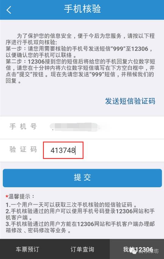 2按照官方提示使用需要验证的手机向12306发送短信999,然后将收到的短信验证码填入对应栏目中,按“提交”后进行验证。