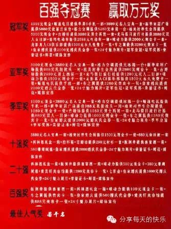 - 3000元现金+3880名人宝典一套+格力空调提供冰箱一台+新华家居广场提供988元乳胶枕头一对+植美村养生会所提供2980元现金卡一张+吉婚坊提供2980元男士西装一套+龙马假日旅行社提供1280元双人二日游+球动力提供1500元现金卡一张+龙影真人CS俱乐部提供1500元永久免费卡一张+顺通电讯提供手机一部+车之翼提供2280元贵宾卡一张+皇家婚庆提供2000元婚庆代金券一张+24寸魅力展片+亚军皇冠+亚军奖杯+荣誉证书+鲜花+媒体宣传。